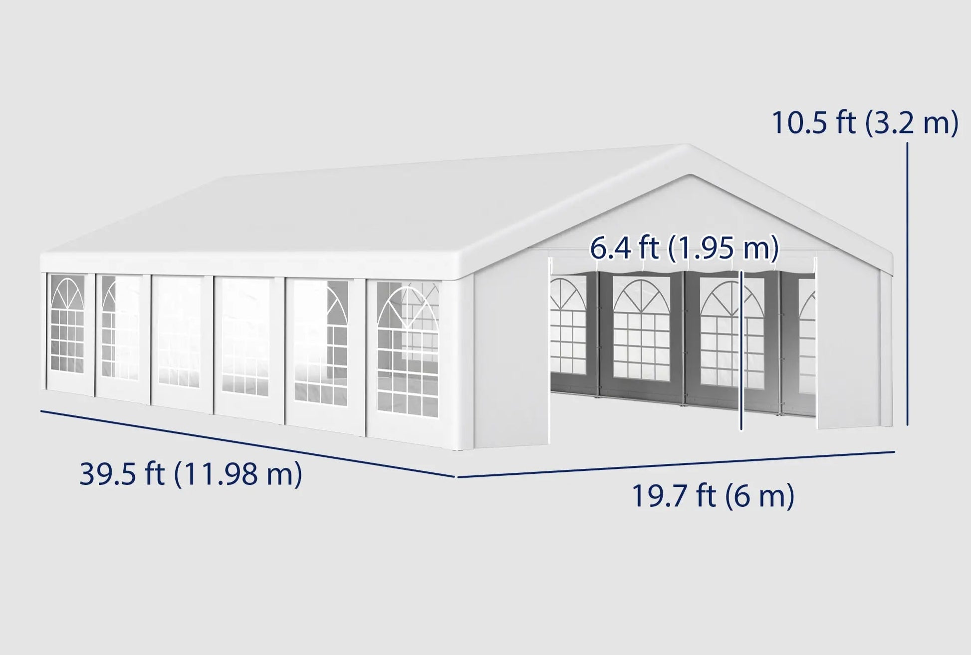 这款宽敞的 20 英尺 x 40 英尺的遮阳篷可将您的户外空间打造成优雅的活动场地。它最多可容纳 80 位宾客,拥有 10.5 英尺高的挑高天花板和加固的角梁,可提供额外支撑。镀锌钢框架和地桩提供卓越的抗风性能,是举办婚礼、后院派对、公司活动等活动的理想之选。