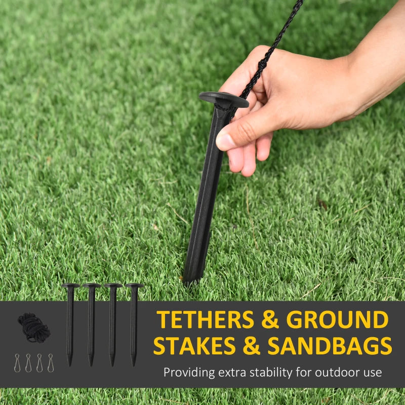 Dimensions & Accessories: Measures 71.75" W x 22.5" D x 48" H and includes stakes, ropes, and sandbags for stability.
