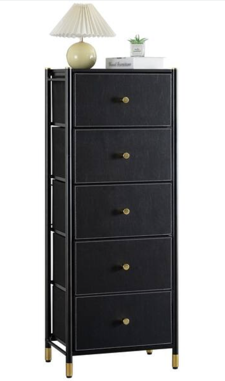 Black Luxury PU Leather 5-Drawer Tall Dresser with Gold Accents
