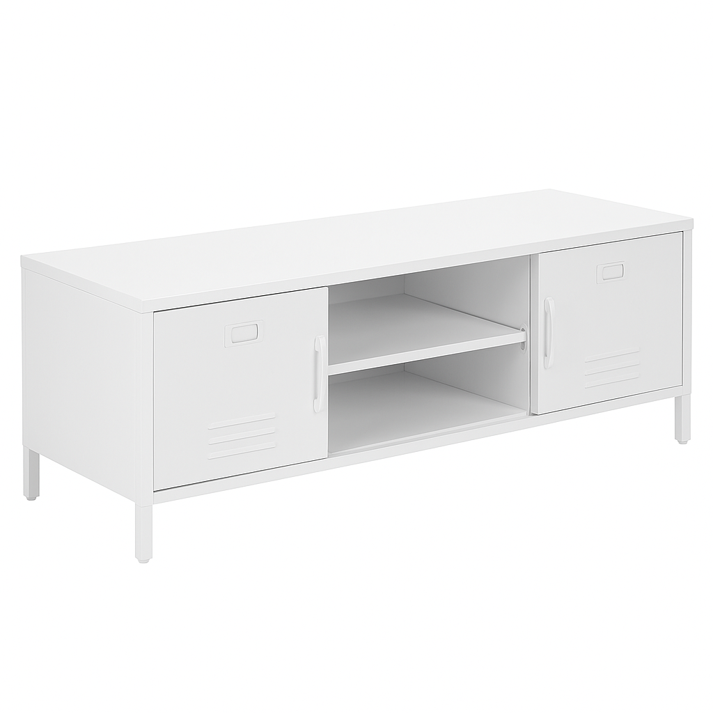 Metal TV Stand with Storage Cabinets, 135.9 cm Wide, White, 2 Doors and Open Shelves for Living Room, up to 60 Inch TV