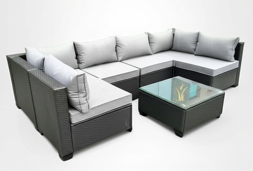 7-Piece Configuration: Includes four corner sofa pieces, two armless sofa pieces, and one glass-top coffee table.